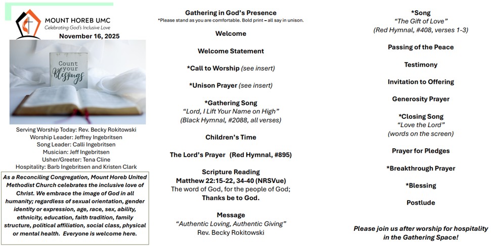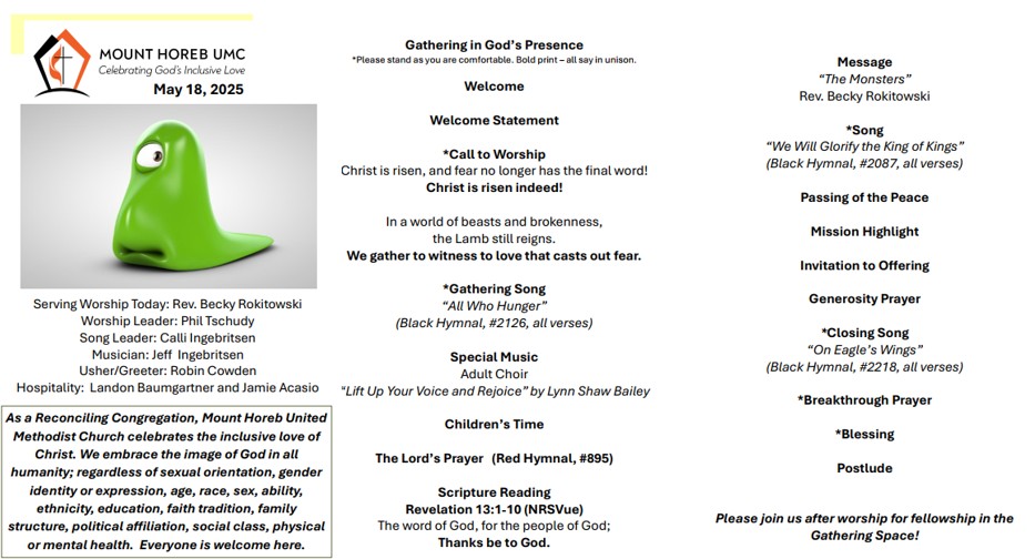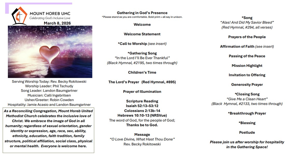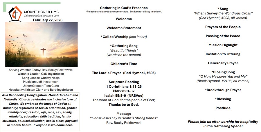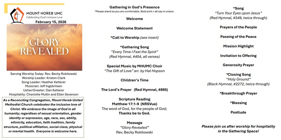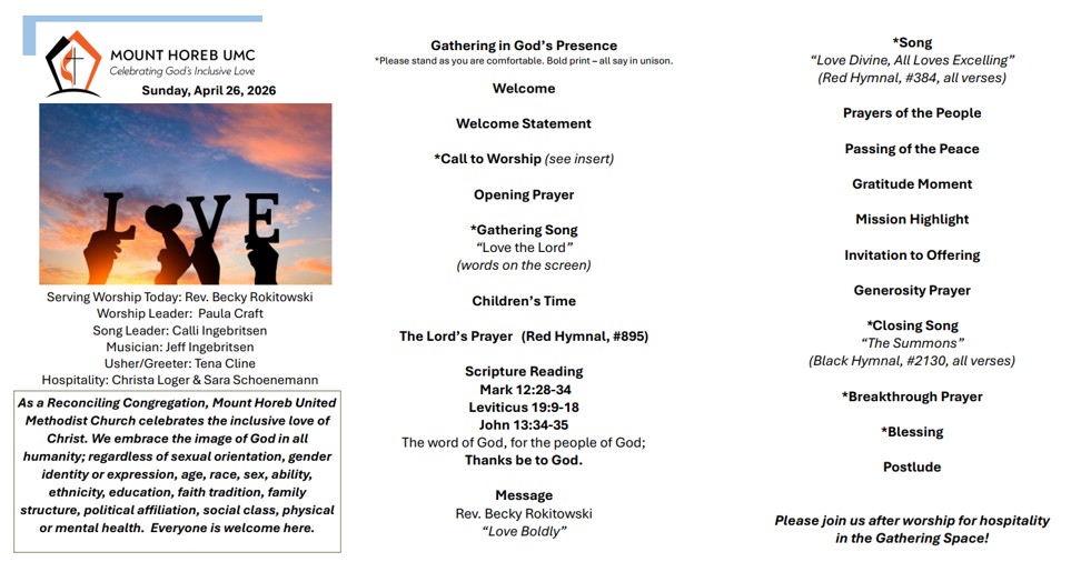 As a Reconciling Congregation, Mount Horeb United Methodist Church celebrates the inclusive love of Christ. We embrace the image of God in all humanity; regardless of sexual orientation, gender identity or expression, age, race, sex, ability, ethnicity, education, faith tradition, family structure, political affiliation, social class, physical or mental health. Everyone is welcome here.